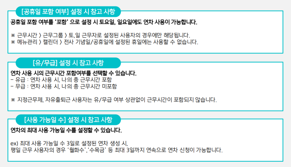 ※ 그 외 내년 휴가 당겨쓰기 허용 여부, 부서장 연차현황 허용 여부 가능도 설정 가능하답니다.