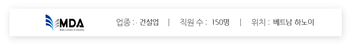 MDA는 베트남 하노이 진출을 시작으로 복합단지 및 산업공단 개발, 주거 및 상업시설 개발 등의 부동산 개발사업과 토목, 건축, 조경 등의 종합건설 사업에 이르기까지 지속적으로 사업영역을 확장해왔으며 현재까지도 쉬지 않고 100년 기업으로 도약하기 위한 힘찬 도전을 진행하고 있습니다.