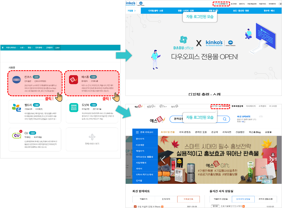 Link+에서는 별도의 개발인력 비용이 소요되는 가입 및 SSO(Single Sign On, 한 번의 로그인으로 여러 서비스 로그인 가능) 연동 기능을 무료로 제공하고 있었습니다. 그 덕분에 다우오피스를 통해서 예스폼과 킨코스 서비스 연동 신청 시, 자동으로 해당 서비스에 접속되어 계정 연동 가입이 가능했고 이후에는 Link+를 통해서 별도의 로그인 없이 클릭 몇 번만으로 원하는 서비스에 접속이 가능했습니다. 그뿐만 아니라 예스폼의 수많은 문서 서식을 활용하여 효율적인 업무처리가 가능하였고, 킨코스를 통해 온라인으로 인쇄물을 주문하면 전국 28개의 매장에서 출력 후 빠르게 인쇄물을 받을 수 있었습니다.