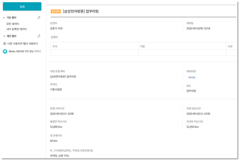 기존에는 법인차량일지를 수기로 작성하고 관리하였는데, Works로 법인차량 관리 앱을 만들어 종이로 일지를 관리하는 번거로움을 해소할 수 있었습니다. 무엇보다 PC뿐 만 아니라 외근 시 모바일로도 일지를 작성할 수 있어 주유량, 차량 위치 등을 바로 파악할 수 있는 점이 만족스럽습니다.