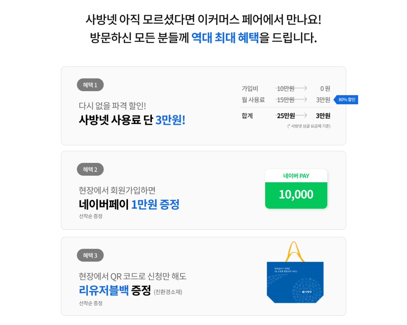 ① 이커머스페어 방문하는 분들에게만! 사방넷 사용료 단 3만 원