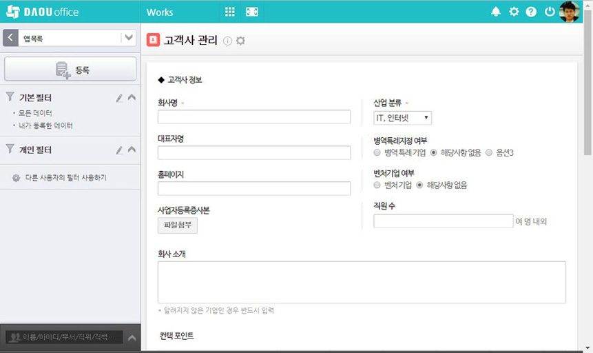 영업팀에서 신규 고객 사 발굴 시, 고객사 기본정보, 컨텍포인트, 매출정보, 영업담당자 데이터 등을 입력하고