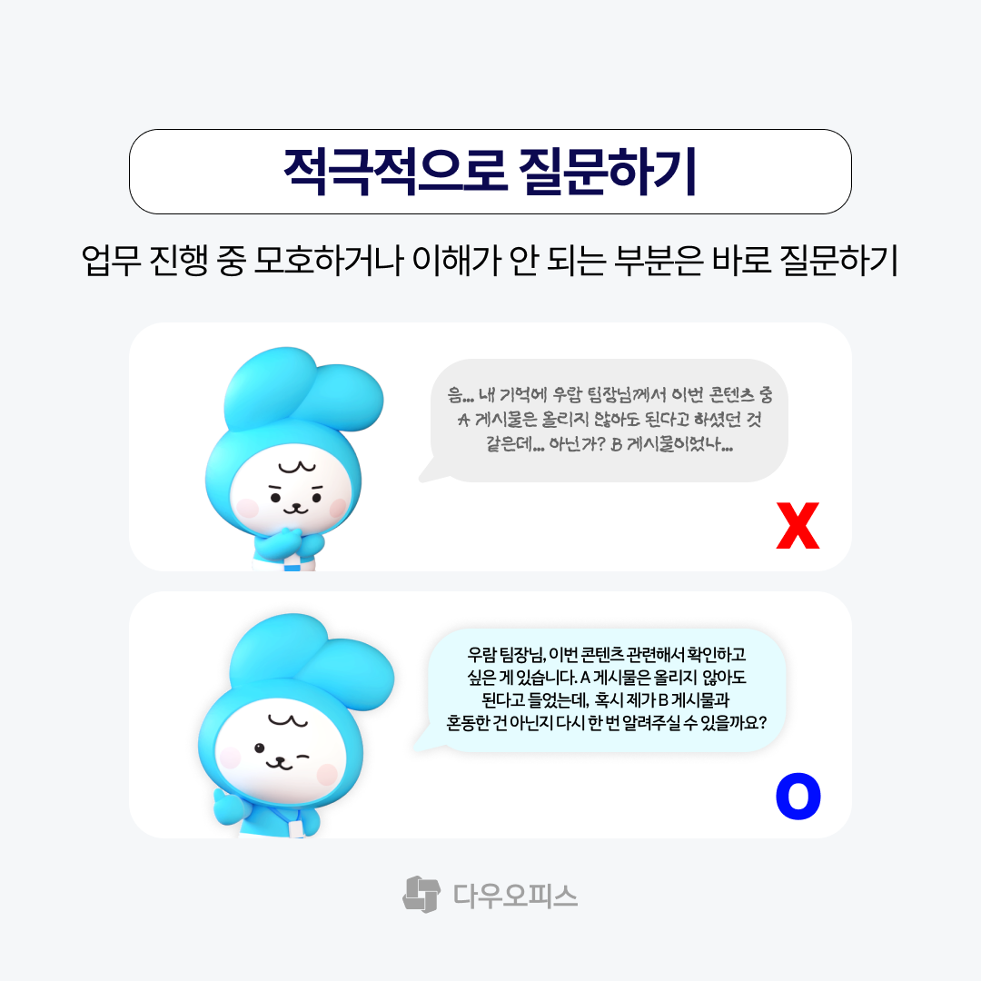 질문을 통해 정확한 업무 지시 방향을 파악할 수 있어 실수할 확률이 줄어들죠.