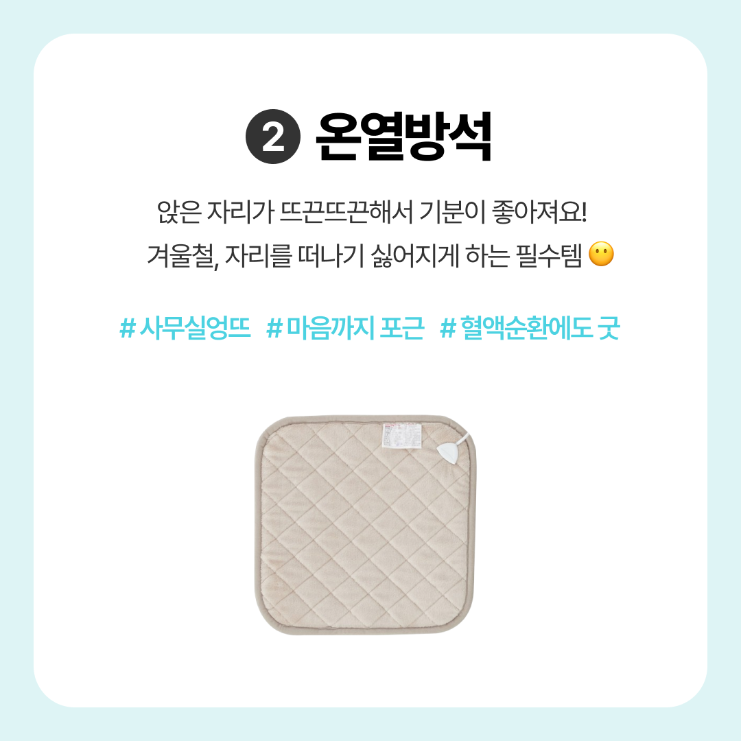 온열 방석을 의자에 깔아두면, 장시간 앉아 있어도 한결 편안하게 업무를 볼 수 있어요!