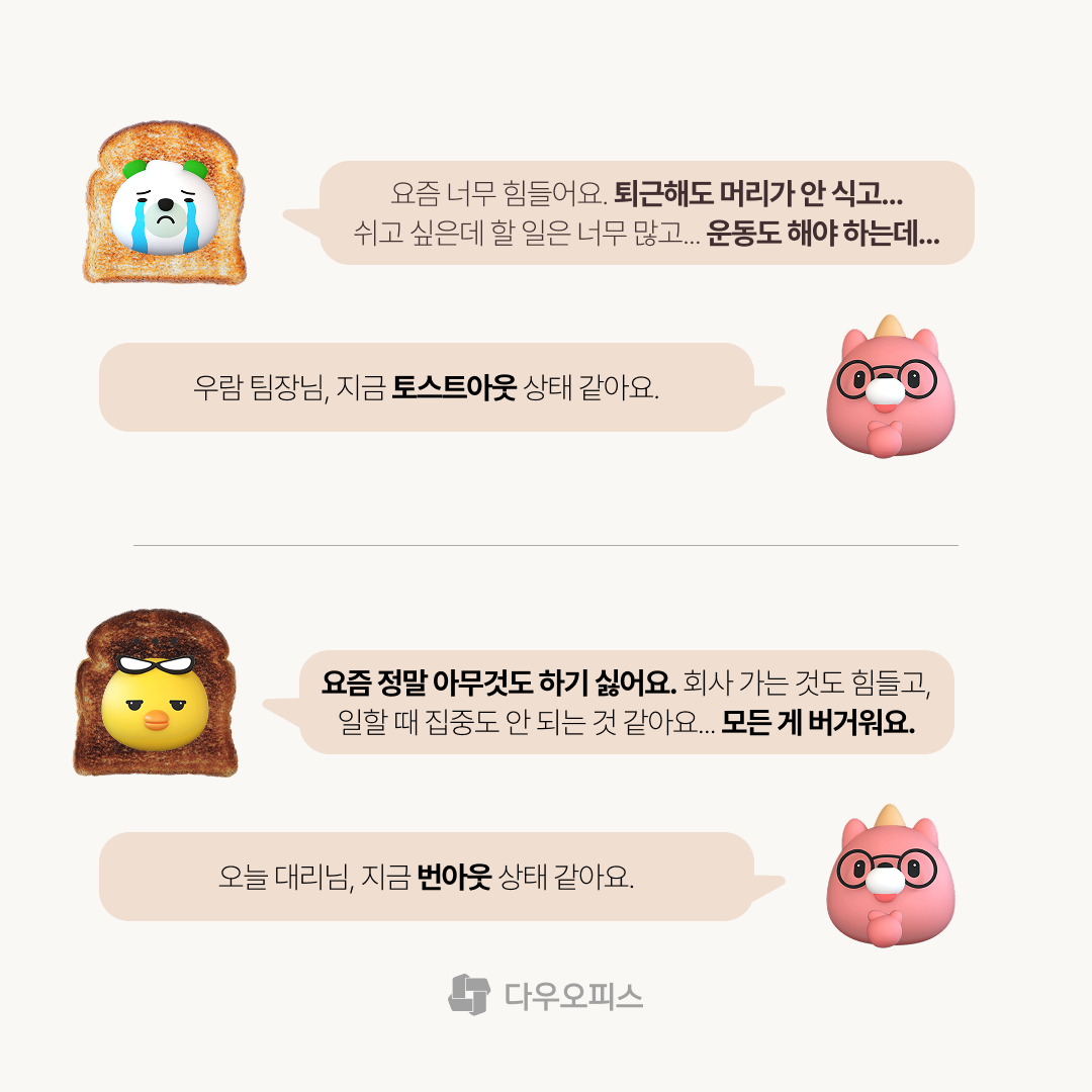 현대 직장인이라면 토스트아웃과 번아웃은 누구나 올 수 있는 현상이에요.