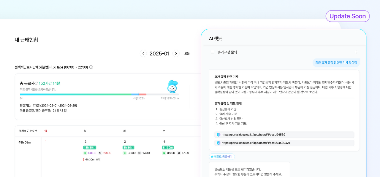 • AI 챗봇 : 직원들의 인사·복지·정책 Q&A 즉시 응답