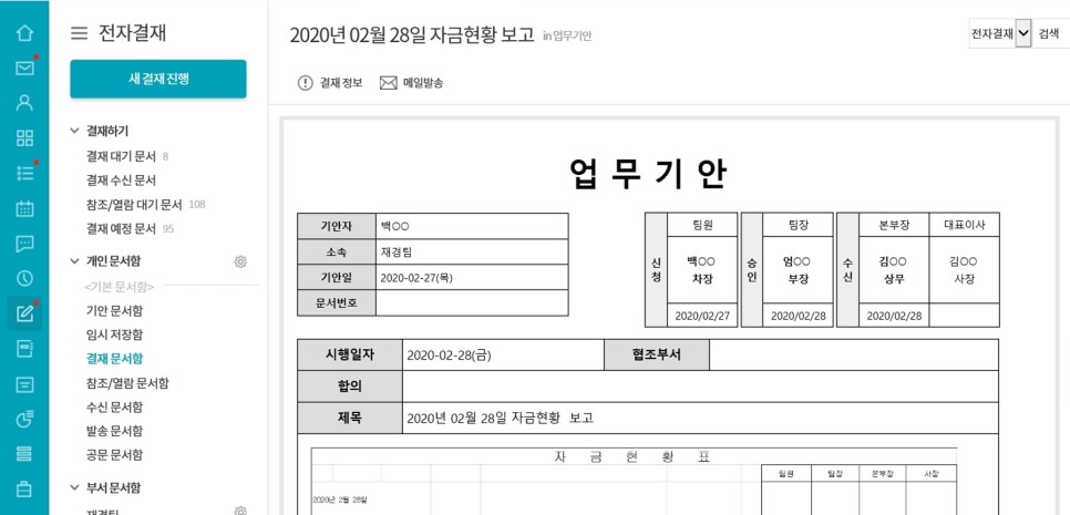 재경팀은 전자결재 기능을 통해 매일 이루어지는 자금현황 보고를 차질없이 진행했습니다.