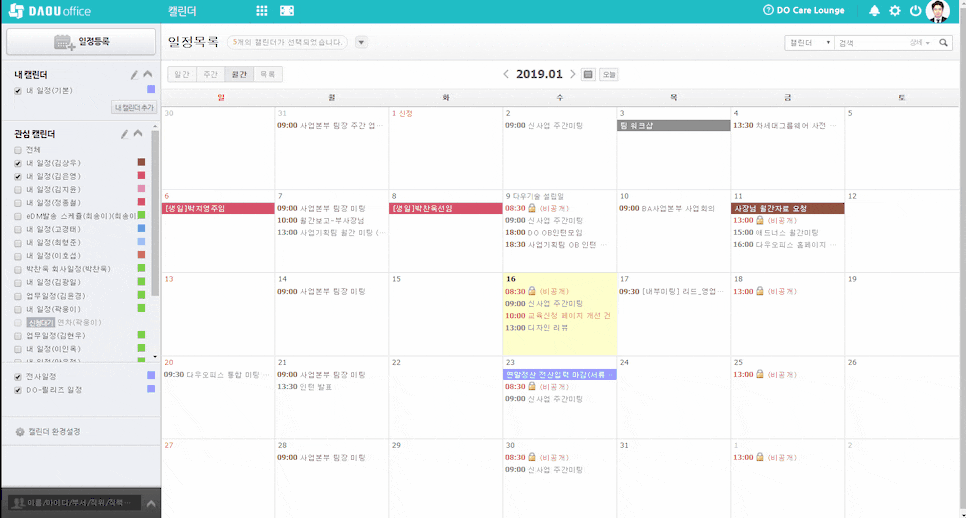 그리고 캘린더를 유용하게 사용하고 있습니다. 관심 직원의 일정을 편하게 확인하고, 알림이나 회의실 예약 같은 기능을 추가 제공해 편이성이 많이 높아졌습니다.