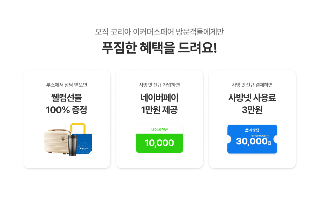 ✔ 이커머스페어 방문 단독 혜택 : 사방넷 사용료 3만 원 + 가입비 전액 면제