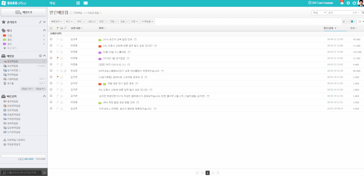 또한, 메일 태그기능과 같이 메일 관리가 유용하여, 기존에 아웃룩을 사용하던 직원들이 자발적으로 다우오피스 메일을 사용하기 시작했습니다. 또한, 아웃룩과 연동까지 되어 메일함 또한 폭넓게 사용하고 있습니다.