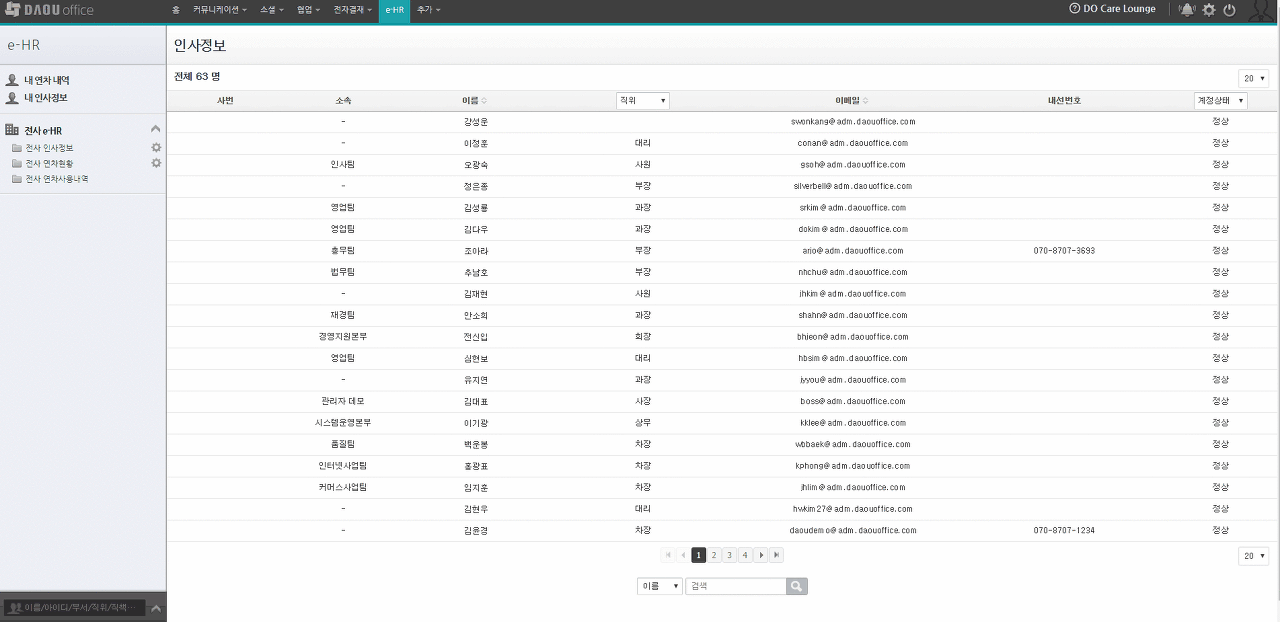 특히, 인사(e-HR) 기능을 활발하게 사용하고 있는 것이 가장 큰 변화입니다. 다우오피스 내에서 직원들의 기본적인 인사사항 및 연차까지 관리할 수 있어, 관리적인 측면에서 많은 시간을 단축할 수 있습니다.