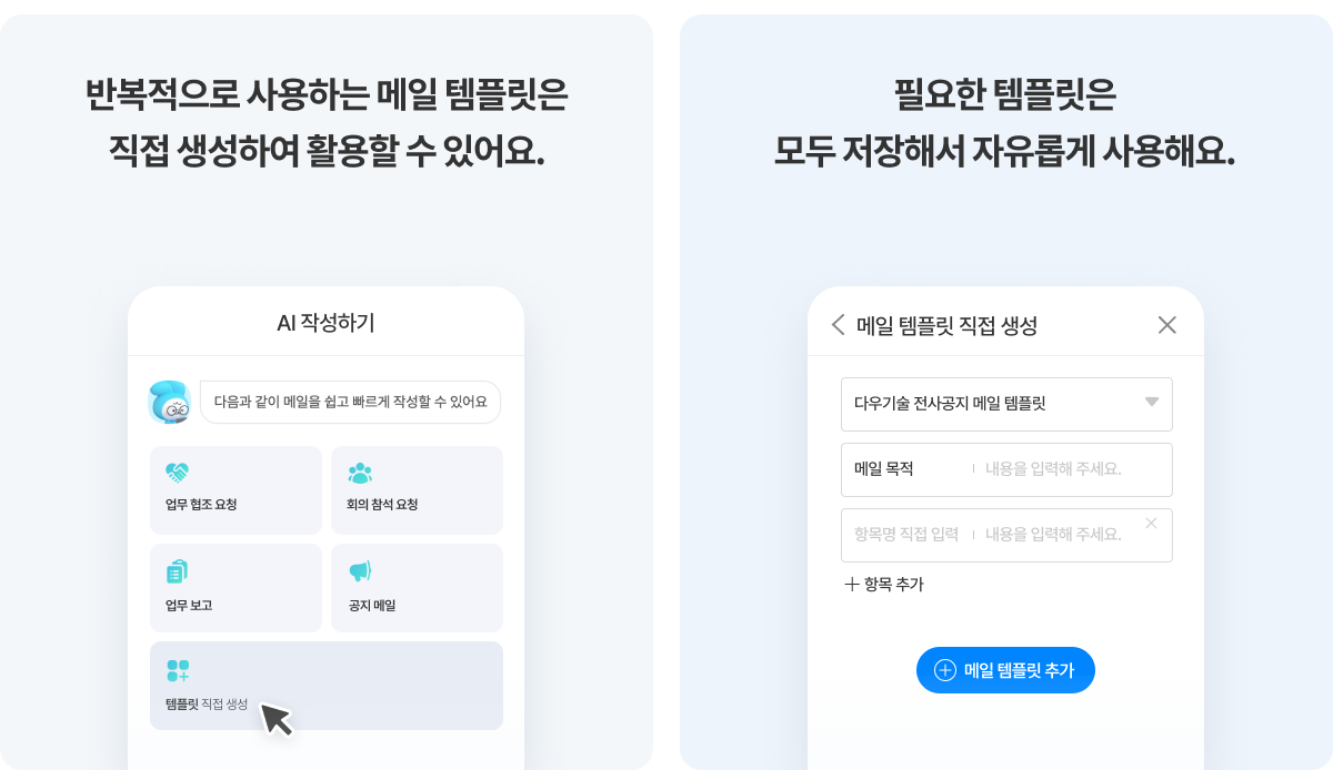- 맞춤형 템플릿 생성: 자주 사용하는 나만의 메일 형식이 있다면 맞춤 템플릿을 만들어 보세요! 필요한 메일 템플릿을 추가하여 보다 빠르게 메일을 작성할 수 있죠.