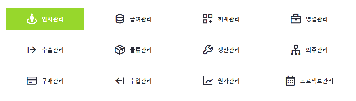 1) 일반관리(인사/급여/회계), 유통(영업/물류/구매/수출/수입), 제조(수불/재고/품질), 원가(활동기준 수익성분석)을 관리할 수 있습니다.