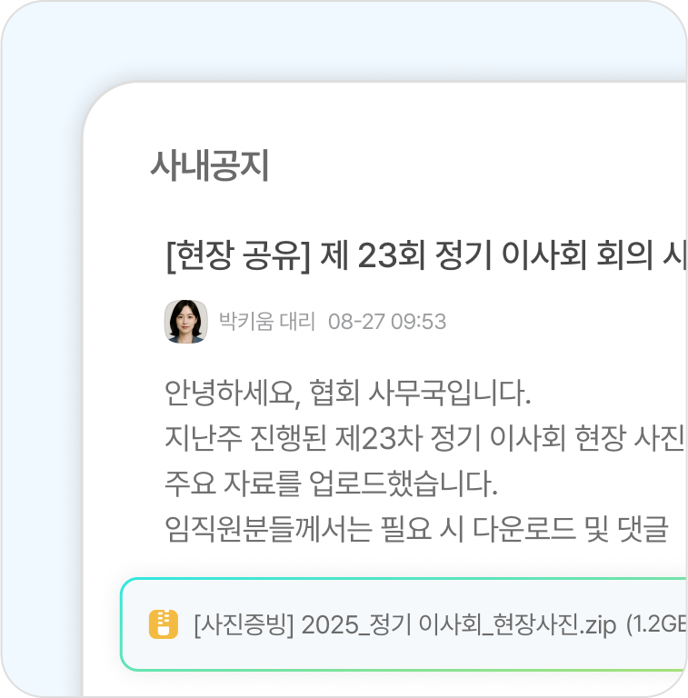 회의, 행사, 현장 활동 사진을 즉시 업로드하여 모든 구성원이 함께 확인할 수 있습니다.