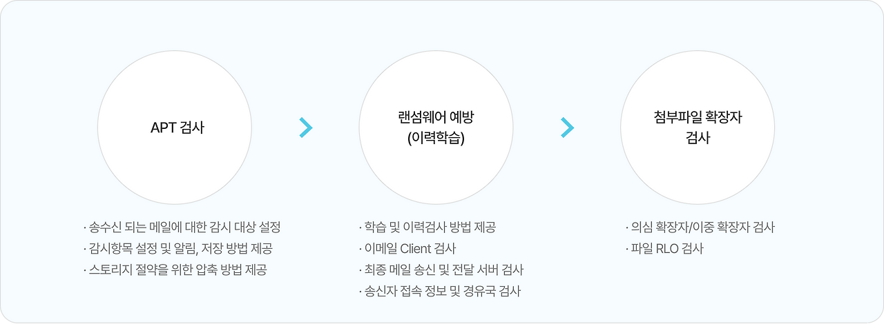 스팸메일 차단, 메일 백업·복구, 랜섬웨어 방어, 기업정보유출방지