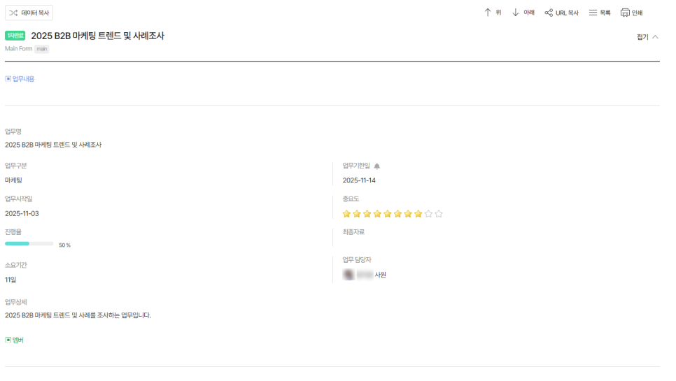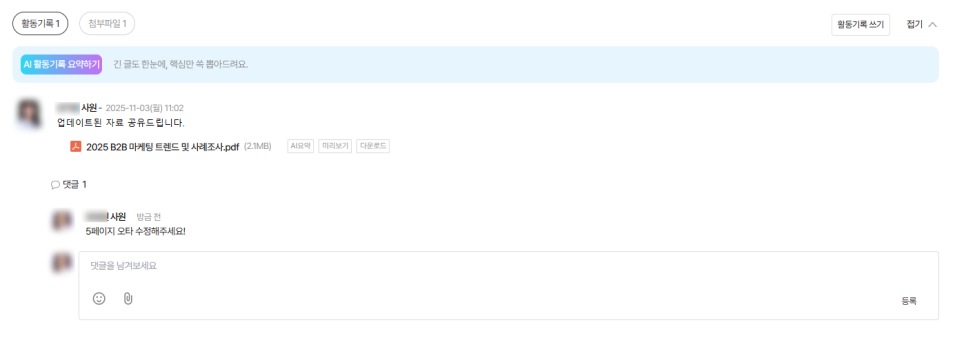 이 정보들이 업무 안에 자연스럽게 남아 있어 새로운 담당자도 업무 흐름을 빠르게 파악할 수 있습니다.